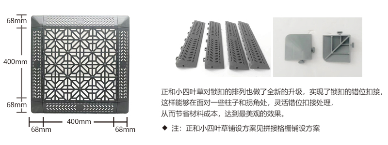 正和小四葉草采用通扣設計,可以確保產品鋪設完成后在任何區域單獨取出,極大的方便了客戶后期局部清理泥沙等,給店面的日常衛生維護提供了很好的基礎。