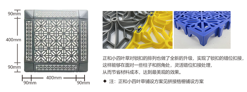 正和小四葉草采用通扣設計,可以確保產品鋪設完成后在任何區域單獨取出,極大的方便了客戶后期局部清理泥沙等,給店面的日常衛生維護提供了很好的基礎。