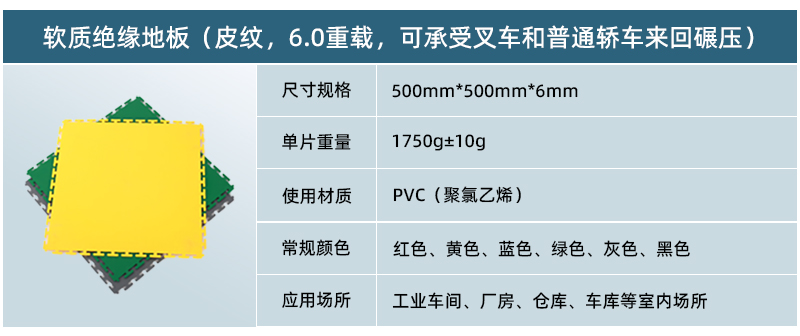 軟質(zhì)絕緣地板采用純新軟性PVC(聚氯乙烯)生產(chǎn)而成,具有防滑、防油、靜音、抗沖擊、高承載等特點(diǎn),可以快捷安裝在任何現(xiàn)有的基板,包括木材,混凝土,環(huán)氧樹脂,瓷磚,水磨石等,廣泛應(yīng)用于車間廠房地面、倉庫地面、車庫地面、健身房、展廳等場所。