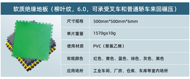 6、色彩絢,易搭配: 軟質絕緣地板常規顏色為紅色、黃色、黑色、灰色、藍色、綠色等顏色,也可根據客戶的要求進行色彩的調整。正方形